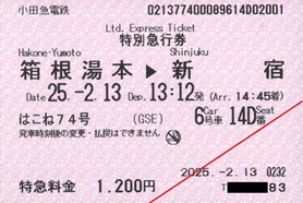 ![]() | 特別急行券 2025年2月13日 はこね74号 箱根湯本→新宿 |